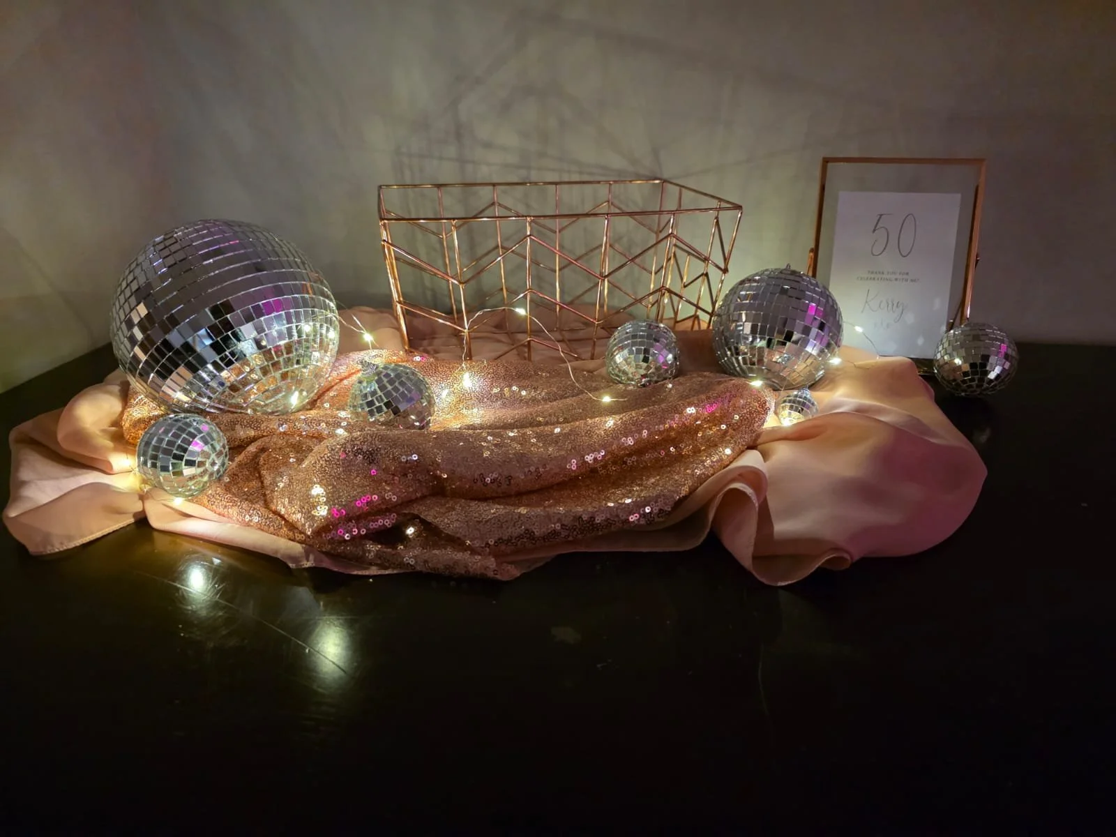 A cluster of small disco balls nestled in between bud vases, candles, or floral arrangements? Yes, please. They catch the candlelight and add dimension without taking over. Perfect for couples who want a fun twist on classic romantic styling.
