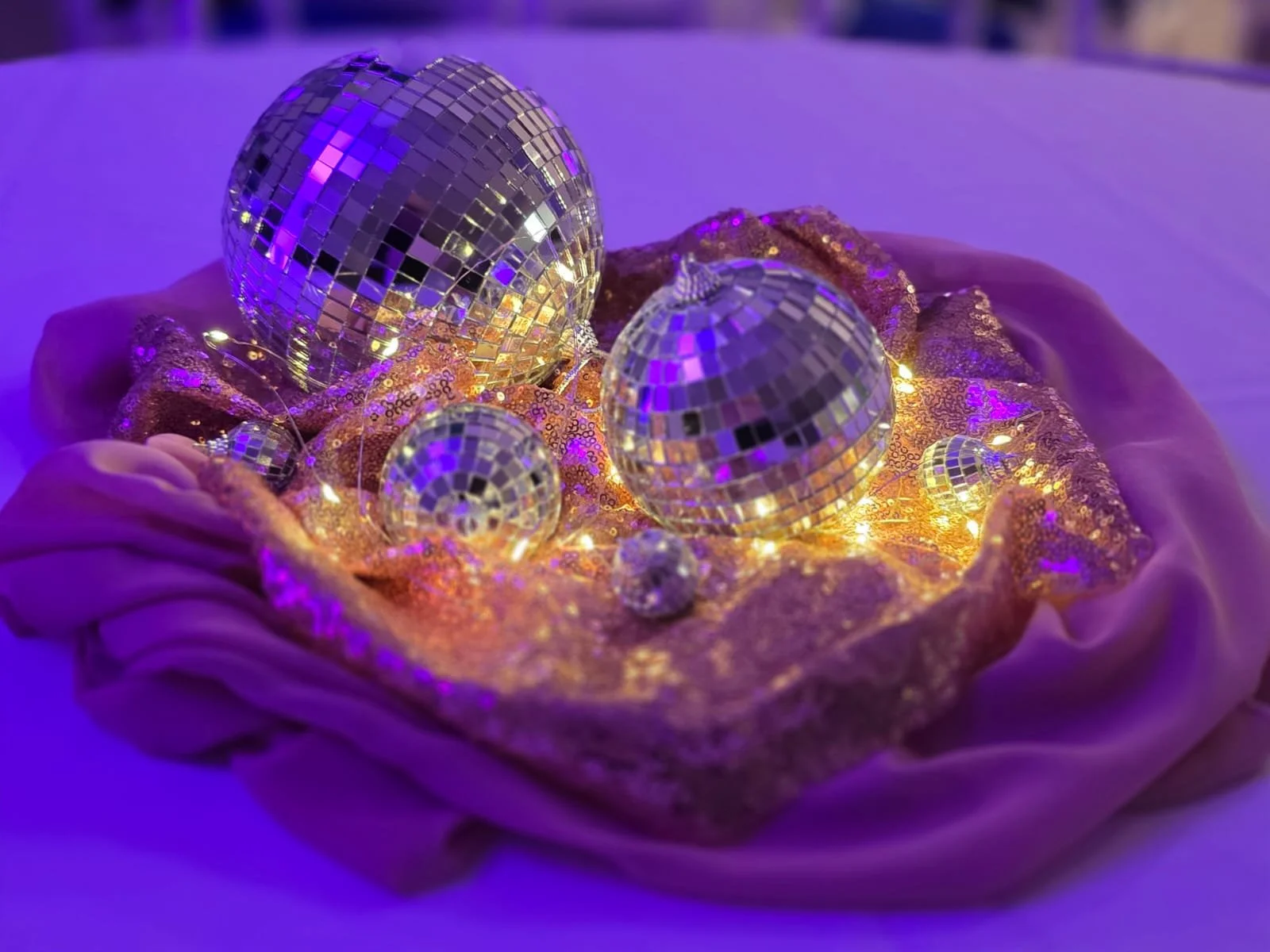 Set the tone from the moment guests arrive with a disco ball-styled welcome area. Pair a few varying-sized disco balls with soft draping, cylinder vases filled with glowing candles, and a beautiful welcome sign. It’s stylish, modern, and a real mood-setter ~ especially as dusk falls.